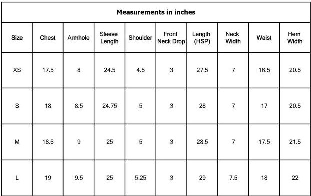 Armhole XS = 8 inches S = 8.5 inches M = 9 inches L = 9.5 inches