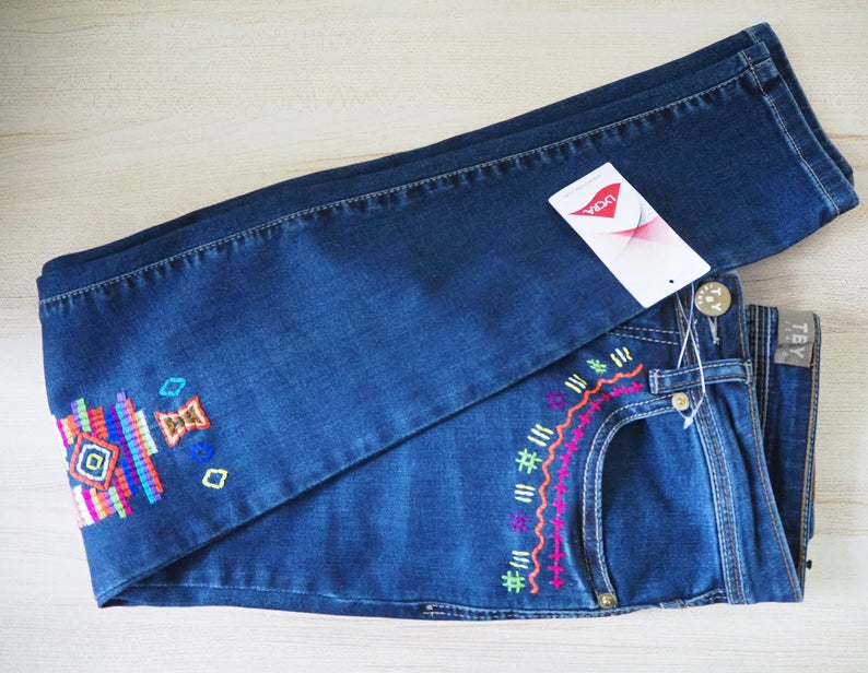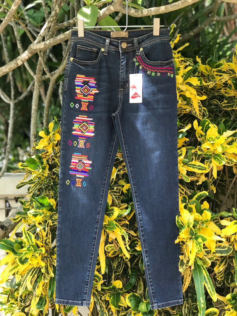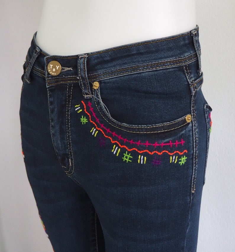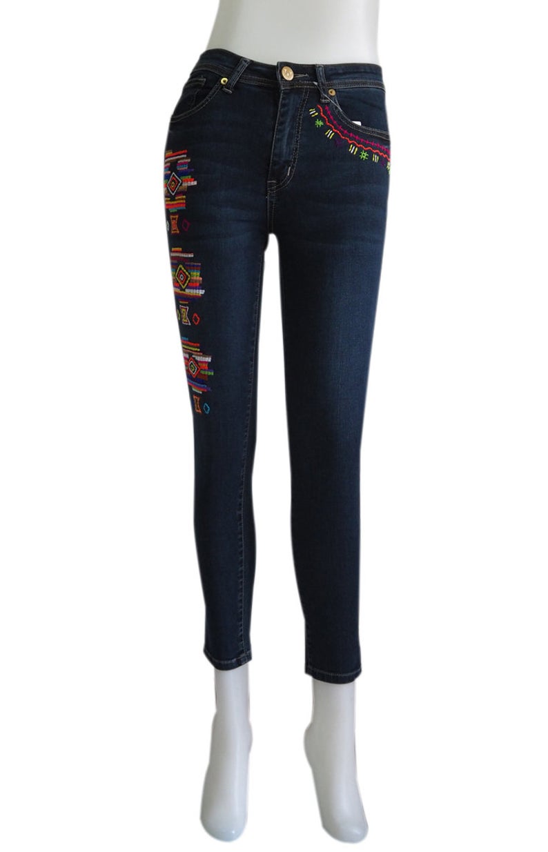 Unique multicolored hand embroidered in different pattern inspired by nature and colorful landscape made it different from another jean, unique and stylish.