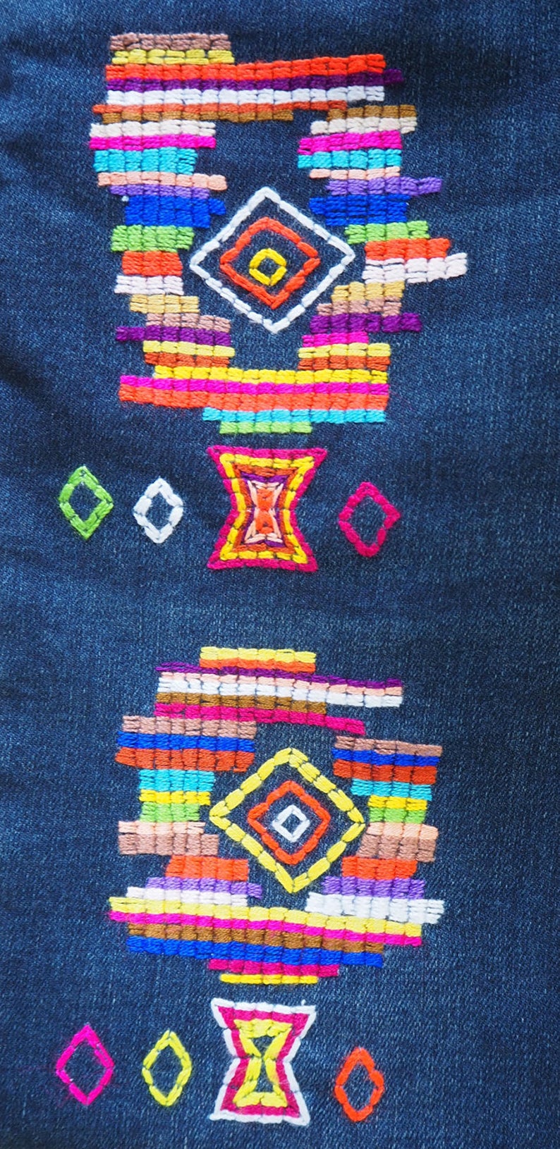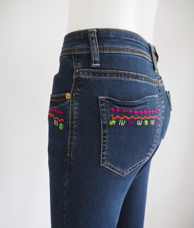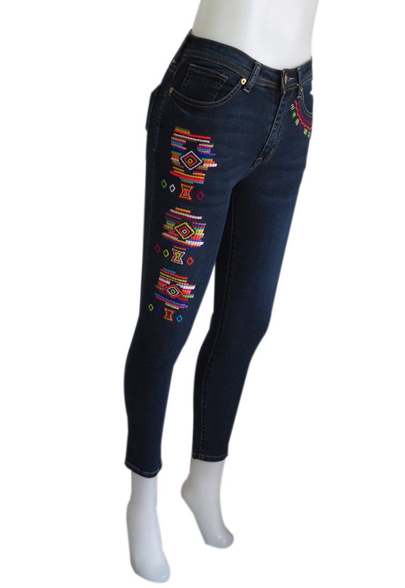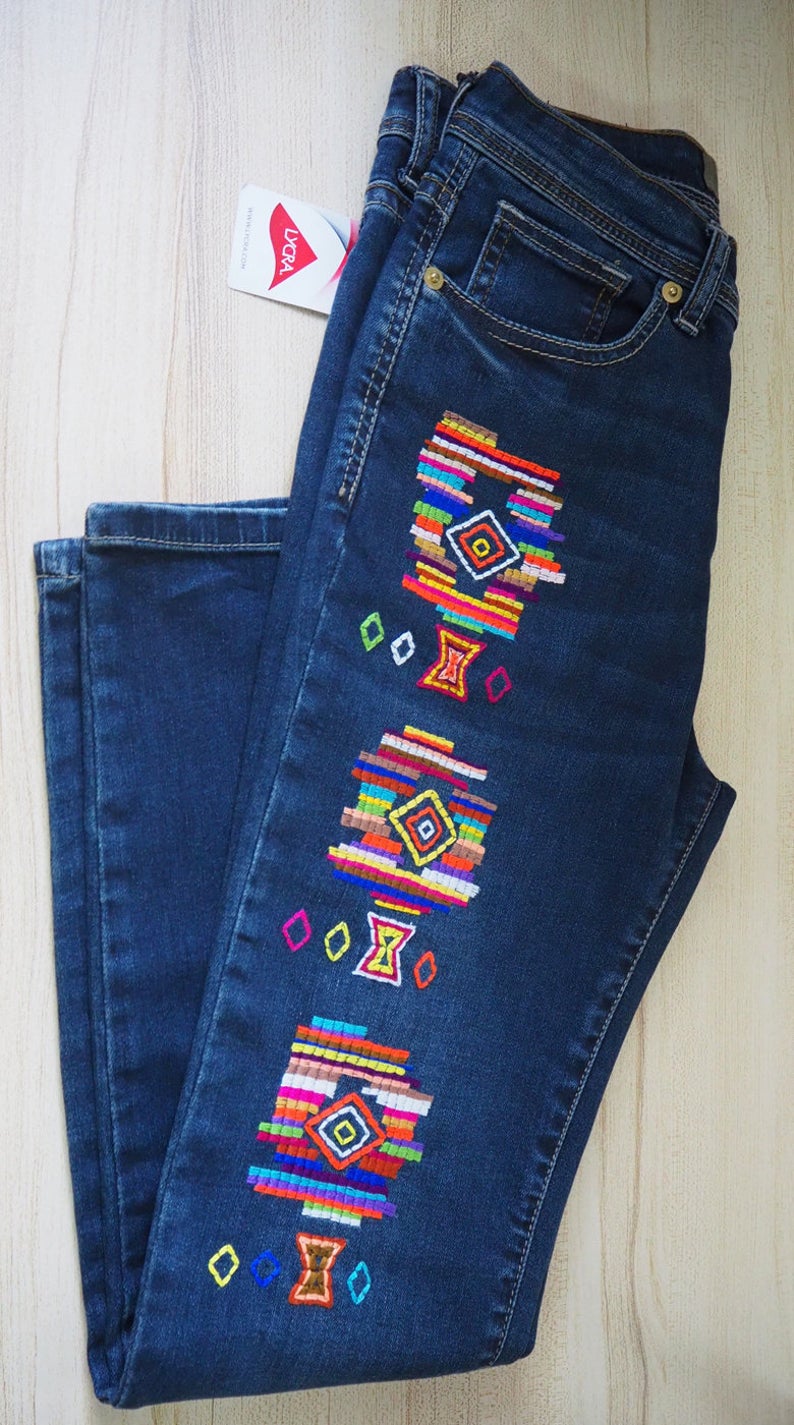 Unique multicolored hand embroidered in different pattern inspired by nature and colorful landscape made it different from another jean, unique and stylish.